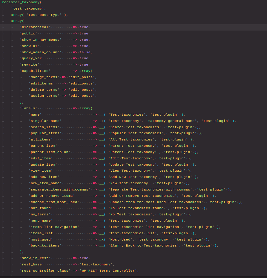 hierarchical-> it states that would our taxonomy support hierarchical format like parent child format.public-> would our taxonomy be publically visible to usersshow_in_nav_menus-> Would our taxonomy be shown in the navigation menusshow_ui-> Will our taxonomy be able to managed using the ui option present in the admin barshow_admin_column-> whether a taxonomy column be visible on the post-type table screencapabilities-> array of capablities of which user is allowed to complete action on this taxonomylabels-> labels to be used at different location for this taxonomy