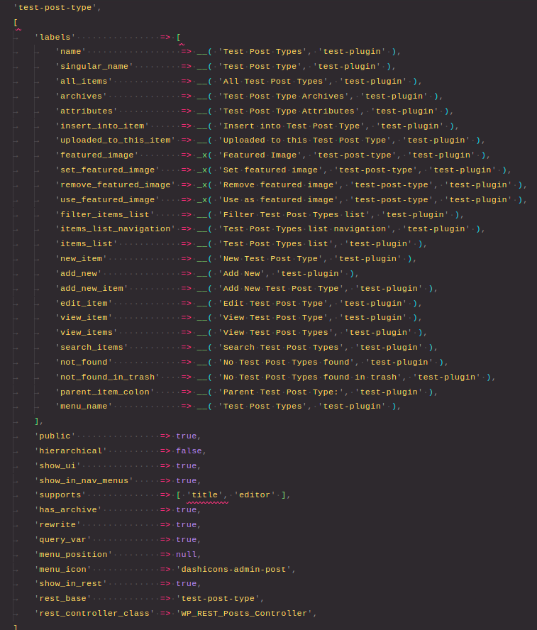 labelsin the array these labels are used at different locations according to their names public-> It states that if our post-type would be publicly availablehierarchical-> It states if our post-type would be hierarchical i.e. parent child structure like pages.show_ui-> It states that if our post-type would be available in the admin uishow_in_nav_menus-> Whether to show our post-type in nav menussupports-> What kind of features our post-type would support for e.g.'title', 'editor', 'comments', 'revisions', 'trackbacks', 'author', 'excerpt', 'page-attributes', 'thumbnail', 'custom-fields', and 'post-formats'has_archive-> Can our post-type show archives (list of posts in it)menu_position-> Menu position for our post-type in admin ui. Check menu position list heremenu_icon-> allows us to change the menu icon in front of the post-type