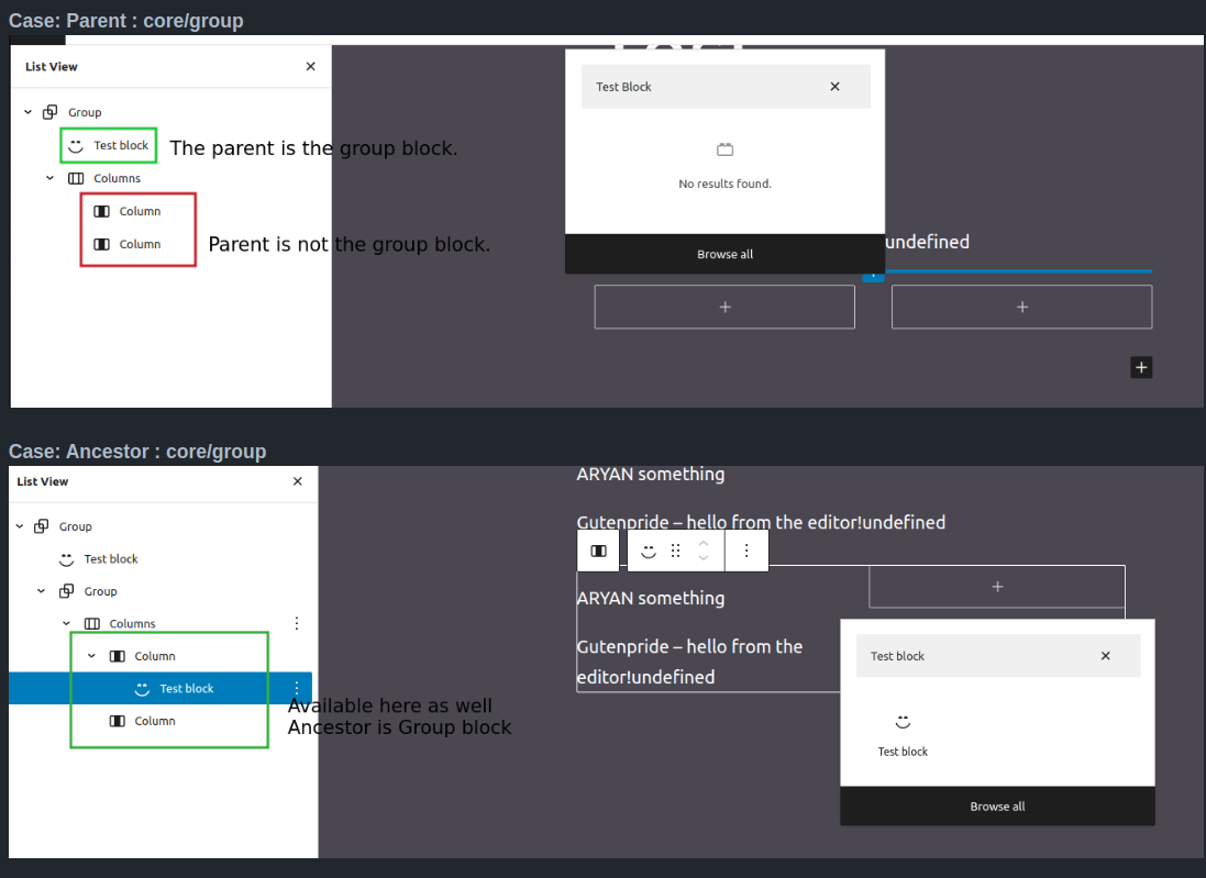 When we register our custom blocks, we can add a condition which would make sure our block can only be added if the parent or ancestor is the specified block. Now let’s check what are parent and ancestor blocks